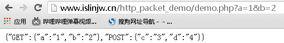 为了验证是否真的传送了数据给服务器,我写了一个 demo 页面 www.islinjw.cn/http_packet_demo/demo.php。这个页面的功能很简单,就是把接收到的 GET 数据和 POST 数据通过 json 格式打印出而已: