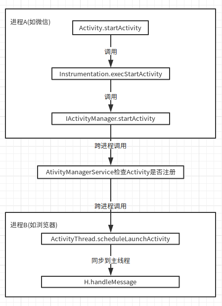 应用将要启动的Activity告诉AMS->AMS检查Activity是否注册->AMS让ActivityThread去创建Activity.