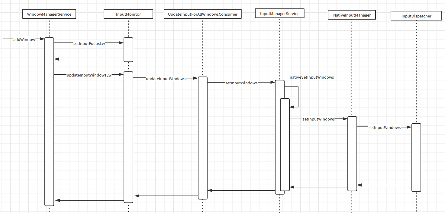 1 2 3 4 5 6 7 8 9 10 11 12 13 14 15 16 17 18 19 20 21 22 23 24 25 26 27 28 29 30 31 32 33 34 35 36 37 38 39 40 41 42 43 44 45 46 47 48 49 50 51 52 53 54 55 56 57 58 59 60 61 62 63 64 65 66 67 68 // frameworks/base/services/core/java/com/android/server/wm/WindowManagerService.java @Override public int addWindow(Session session, IWindow client, int seq, WindowManager.LayoutParams attrs, int viewVisibility, int displayId, Rect outContentInsets, Rect outStableInsets, Rect outOutsets, InputChannel outInputChannel) { ... if (focusChanged) { mInputMonitor.setInputFocusLw(mCurrentFocus, false /*updateInputWindows*/); } mInputMonitor.updateInputWindowsLw(false /*force*/); ... } // frameworks/base/services/core/java/com/android/server/wm/InputMonitor.java void updateInputWindowsLw(boolean force) { ... mUpdateInputForAllWindowsConsumer.updateInputWindows(inDrag); ... } // frameworks/base/services/core/java/com/android/server/wm/InputMonitor.java private void updateInputWindows(boolean inDrag) { ... mService.mInputManager.setInputWindows(mInputWindowHandles, mFocusedInputWindowHandle); ... } // frameworks/base/services/core/java/com/android/server/input/InputManagerService.java public void setInputWindows(InputWindowHandle[] windowHandles, InputWindowHandle focusedWindowHandle) { ... nativeSetInputWindows(mPtr, windowHandles); } // frameworks/base/services/core/jni/com_android_server_input_InputManagerService.cpp static void nativeSetInputWindows(JNIEnv* env, jclass /* clazz */, jlong ptr, jobjectArray windowHandleObjArray) { NativeInputManager* im = reinterpret_cast<NativeInputManager*>(ptr); im->setInputWindows(env, windowHandleObjArray); } // frameworks/base/services/core/jni/com_android_server_input_InputManagerService.cpp void NativeInputManager::setInputWindows(JNIEnv* env, jobjectArray windowHandleObjArray) { ... mInputManager->getDispatcher()->setInputWindows(windowHandles); ... } // frameworks/native/services/inputflinger/InputDispatcher.cpp void InputDispatcher::setInputWindows(const Vector<sp<InputWindowHandle> >& inputWindowHandles) { ... mWindowHandles = inputWindowHandles; sp<InputWindowHandle> newFocusedWindowHandle; ... for (size_t i = 0; i < mWindowHandles.size(); i++) { const sp<InputWindowHandle>& windowHandle = mWindowHandles.itemAt(i); ... if (windowHandle->getInfo()->hasFocus) { newFocusedWindowHandle = windowHandle; } ... mFocusedWindowHandle = newFocusedWindowHandle; } ... }