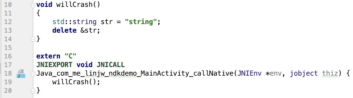 解释完了_Z9willCrashv我们再来说说Java_com_me_linjw_ndkdemo_MainActivity_callNative,为什么它又没有被修饰呢?原因就在于函数上面的extern “C”,它告诉编译器将这个函数当做c语言的函数来处理。而c语言是没有重载这一说的,所以也就不会改变它原本的函数名。