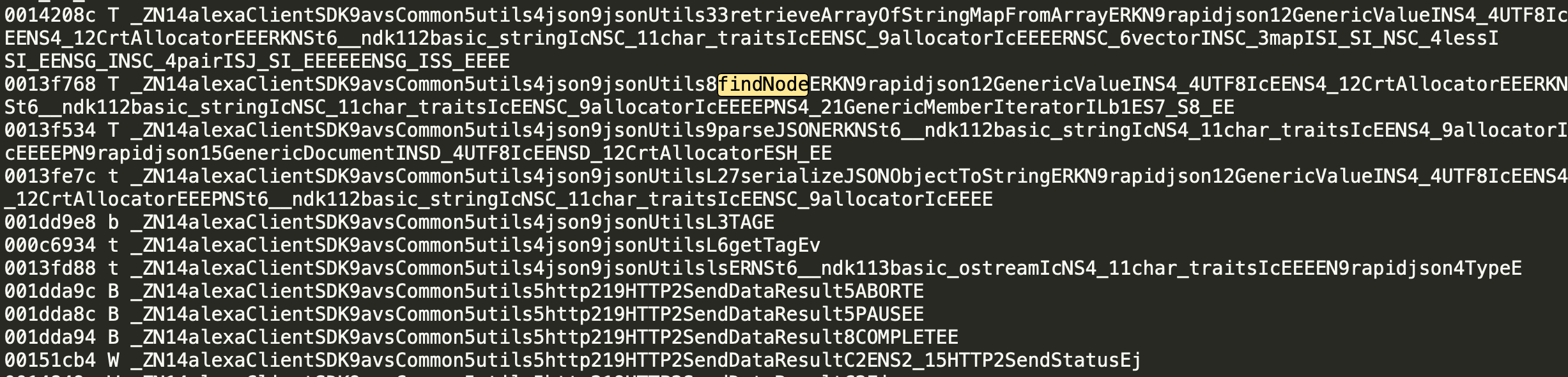 我们使用nm命令打印libAVSCommon.so的符号表可以看到,alexaClientSDK::avsCommon::utils::json::jsonUtils::findNode这个函数在so里面是存在的,而且是有定义的(符号类型是T不是U):