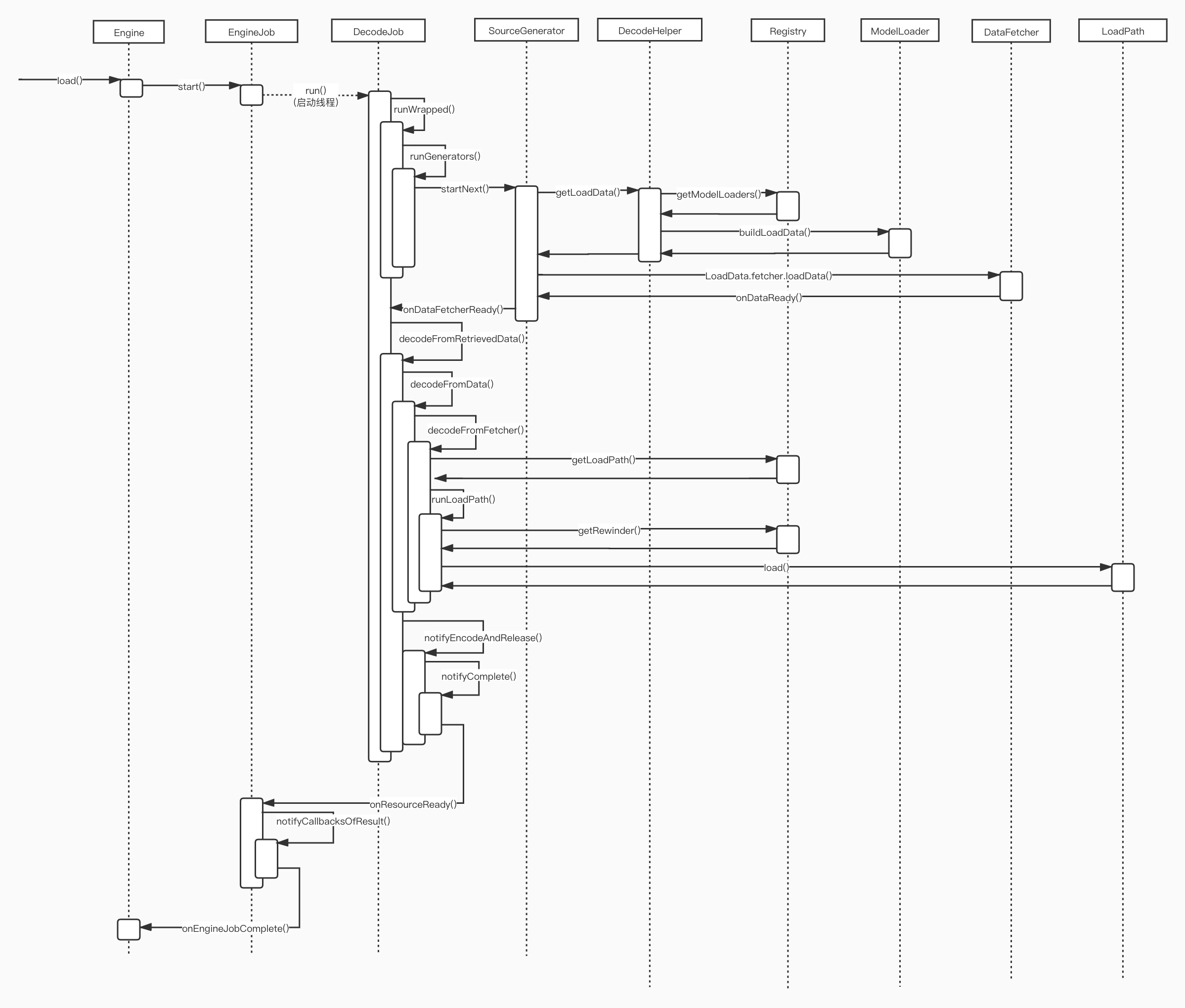 总结 之后的流程就是不断回到到Engine去放到弱引用缓存里面的。到这里整个网络资源的下载解码流程也就讲完了,我们来看看简化之后的时序图: