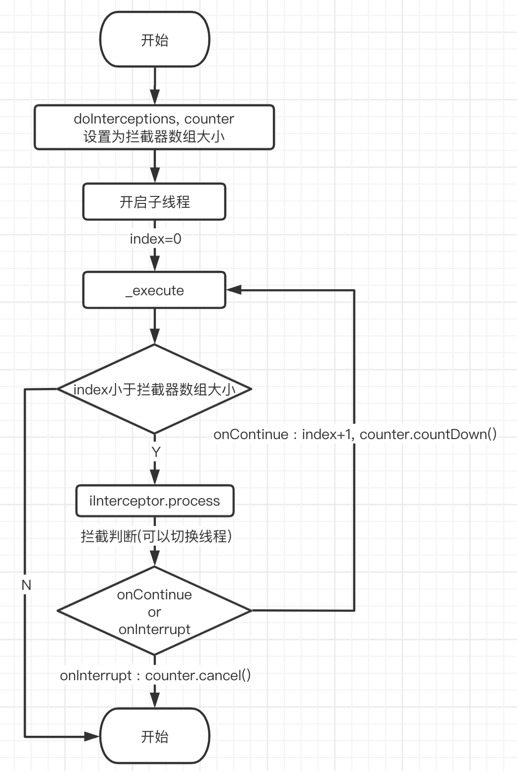 总结下就是doInterceptions里面开启子线程,设置CancelableCountDownLatch为拦截器数组大小,然后调用第一个拦截器,接着线程等待CountDown取消或者为0。拦截器调用onContinue让CountDown减一和继续调用下一个拦截器直到遍历完所有拦截器或者有拦截器调用onInterrupt。