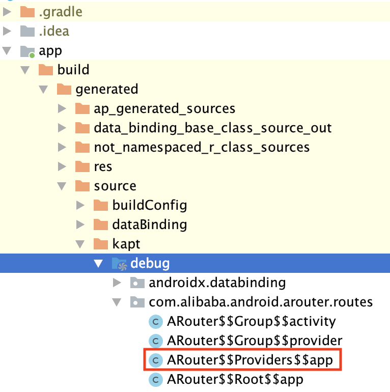 像ARouter$$Root$$app这个分组类就注册了我们的页面路由,而ARouter$$Root$$provider这个分组类就注册了我们的provider路由:
