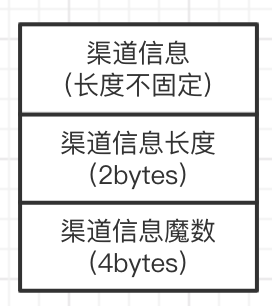 于是我们在运行的时候就能通过读取apk包的结尾4个字节看看是否能读到我们定义的魔数判断有无渠道信息,如果有的话往前两个字节读渠道信息的长度,最后根据长度再往前读取渠道信息。