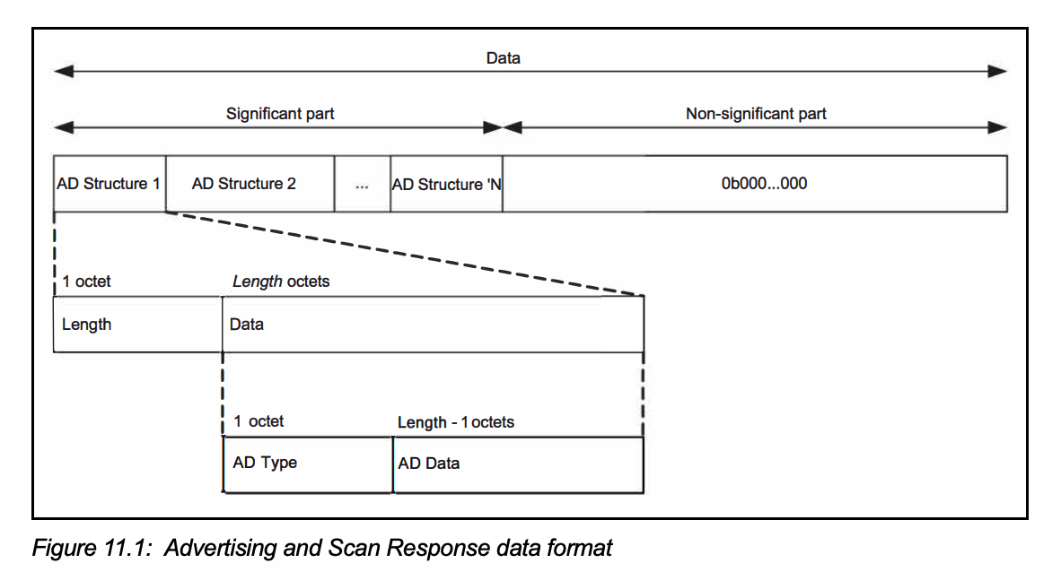 由于这两种方式都基于广播,所以它们的数据格式是一样的。广播会自带一些信息,例如设备的名称、MAC地址等。除了自带的数据之外,我们还能携带一些额外的信息数据。根据官方的文档,可以看到这个额外数据的具体格式如下: