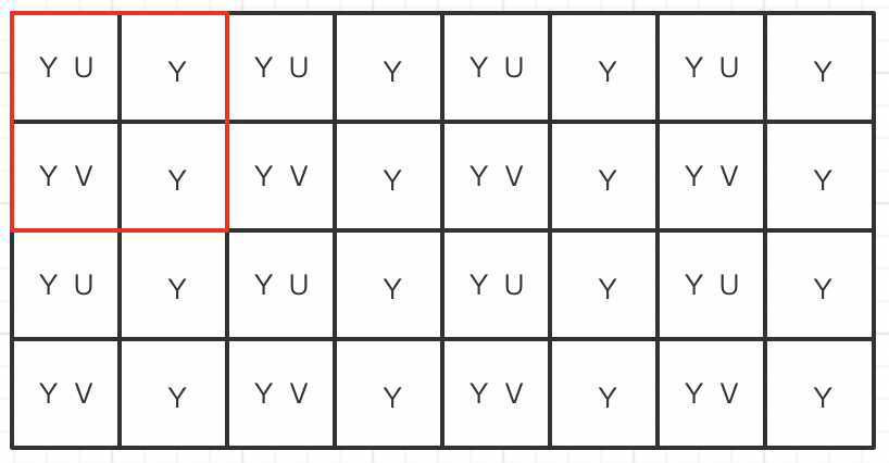 每四个像素共用一对UV分量,每像素平均占用Y + U + V = 8 + 2 + 2 = 12 bits