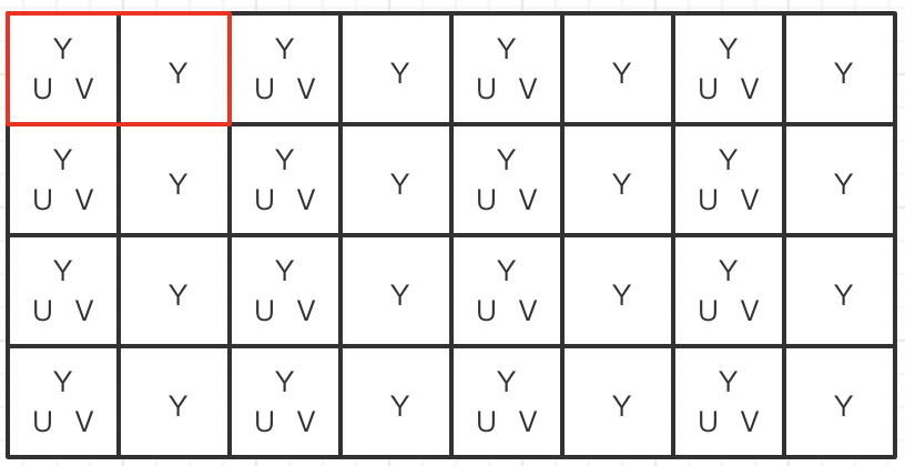 每两个像素共用一对UV分量,每像素平均占用Y + U + V = 8 + 4 + 4 = 16 bits