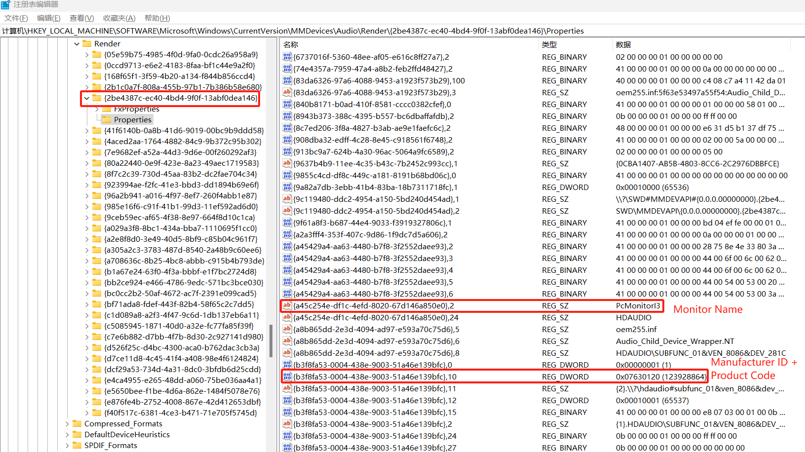 然后到注册表编辑器的计算机\HKEY_LOCAL_MACHINE\SOFTWARE\Microsoft\Windows\CurrentVersion\MMDevices\Audio\Render\下找到对应id然后在Properties里面将Manufacturer ID+Product Code信息删除接着插拔hdmi即可。
