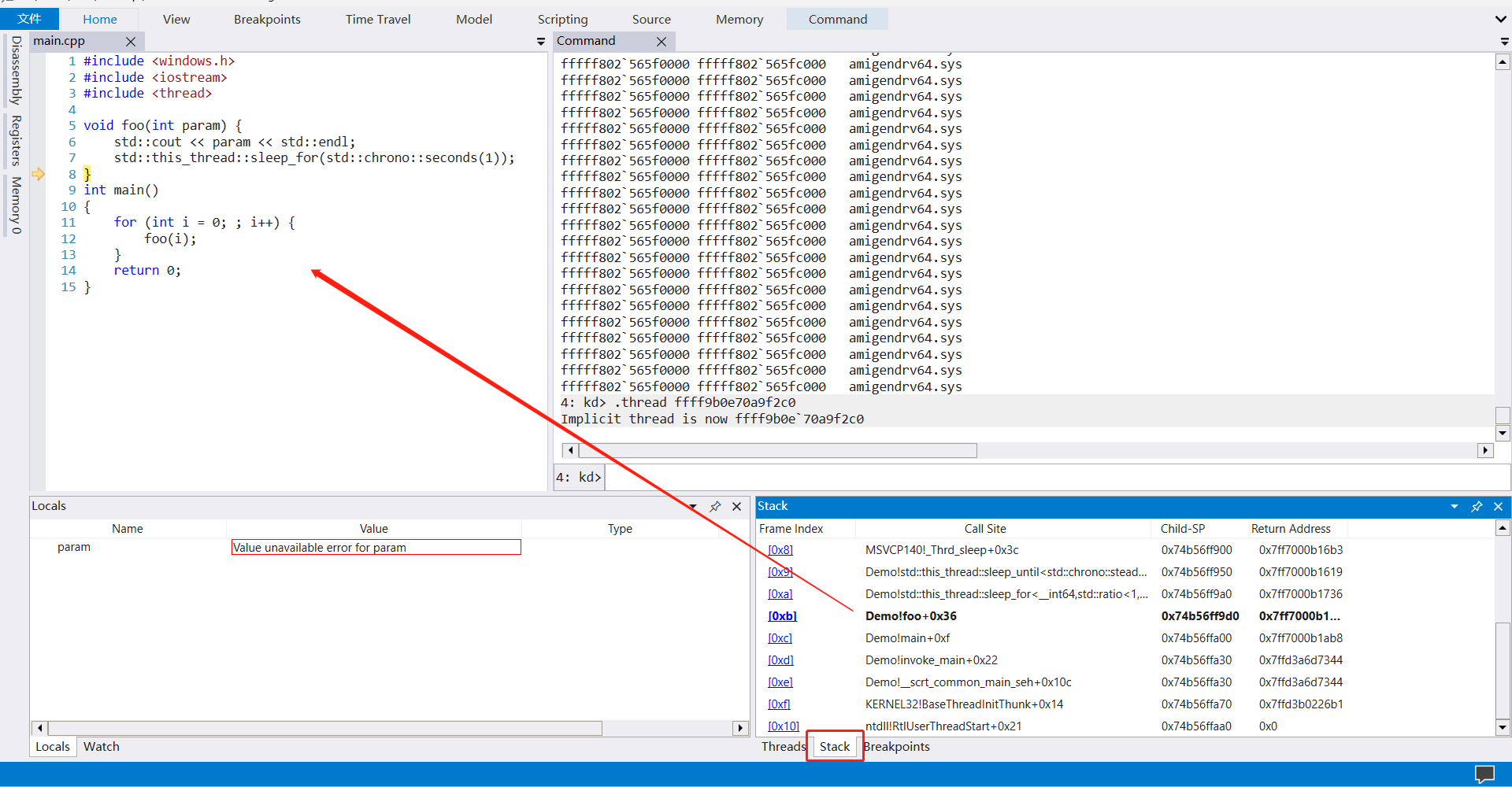 有时候还能在Locals窗口看到传入函数的参数的值,虽然这个dump没有抓到param的值。